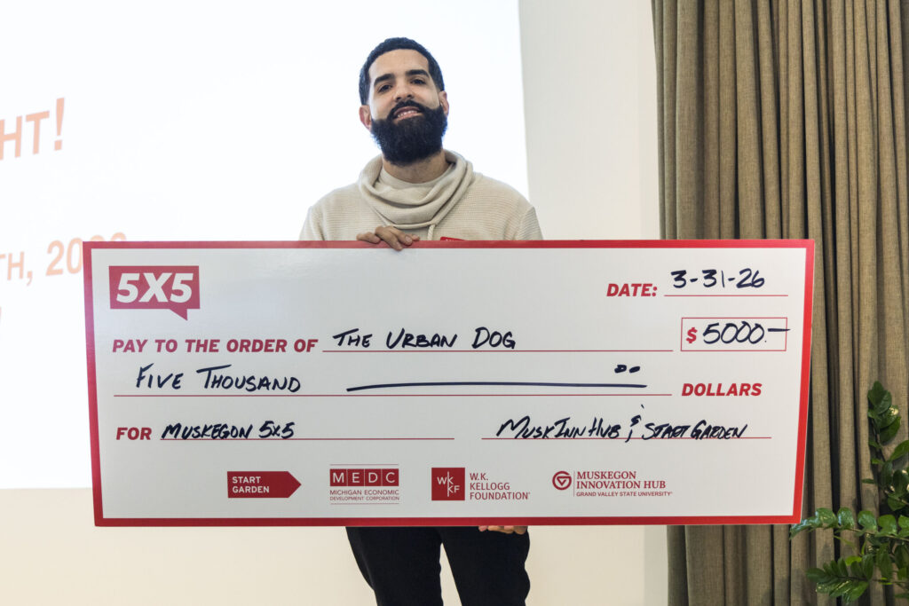 Congratulations to Eduardo Juan Archeval for winning 5×5 Night at the Muskegon Innovation Hub! His idea, The Urban Dog, is a Puerto Rican-inspired street food concept in Grand Rapids that brings bold Caribbean flavor to the classic American hot dog.